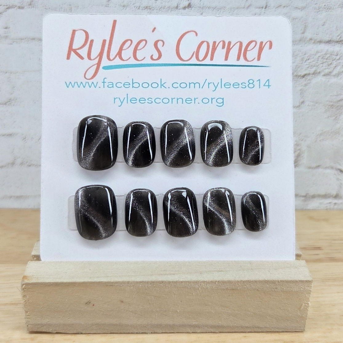 Dive into cosmic glamour with these Midnight Galaxy Cat Eye press-on nails! Handcrafted with a deep, glossy black base and mesmerizing silver-gray magnetic streaks that shift and shimmer like a starry night sky, each set captures the hypnotic allure of a swirling galaxy right at your fingertips. Perfect for adding instant drama to any look—whether it’s a night out, holiday party, or everyday edge—these salon-quality nails feature a durable, high-shine finish that lasts for days.